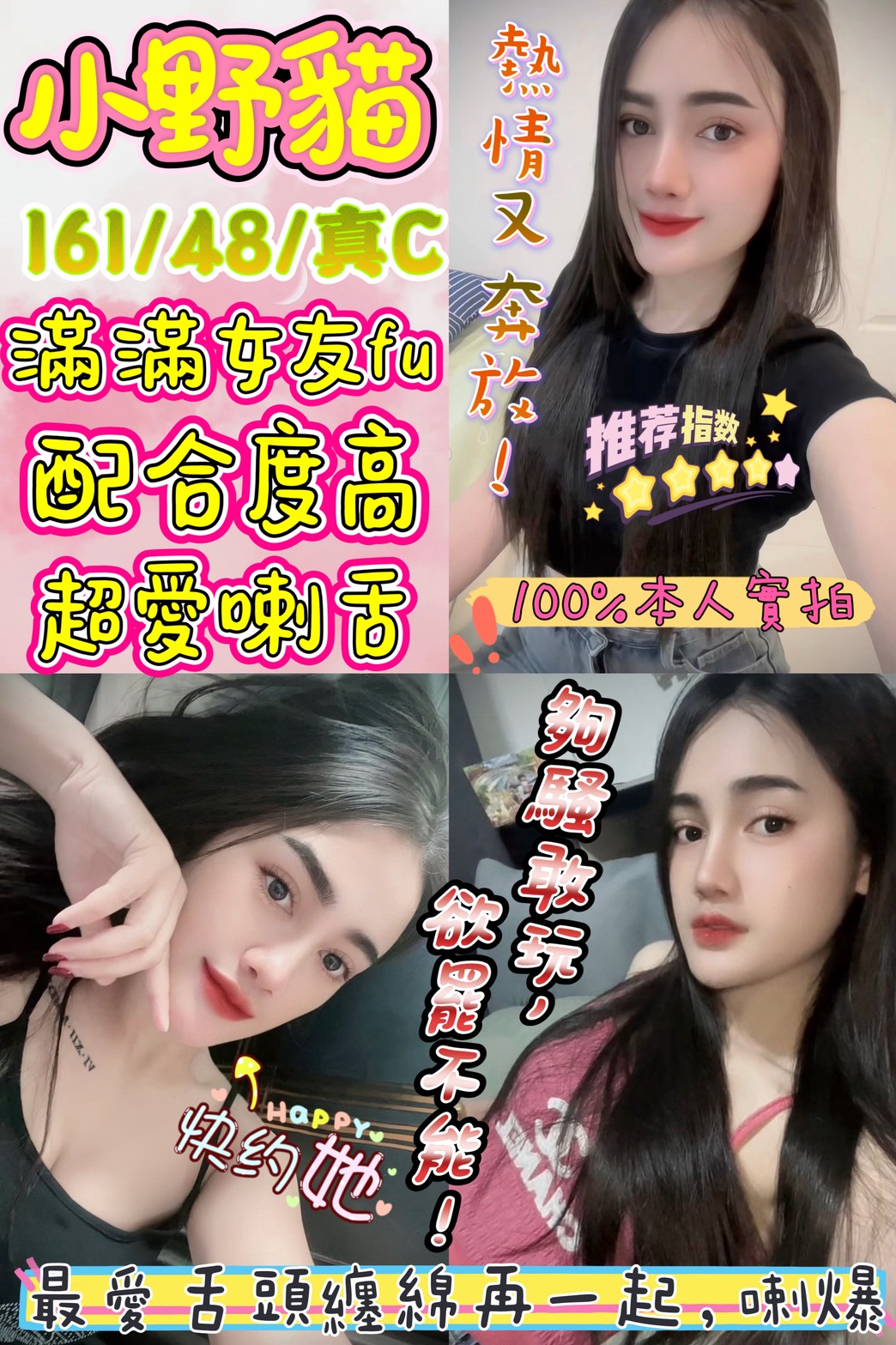 🔞 小野貓 161 / 48 / 真C 🔞 ✨ 舌吻入珠戰神 ‧ 親密開發系尤物 ✨ 🔥 狂野實戰魅力 擁有 161cm 的名模黃金比例,配上觸感紮實的真C罩杯,每一寸肌膚都透著誘人的光澤!小野貓是專為「老司機」打造的激情開發系女神,尤其是對入珠哥哥們擁有極高的包容度與實戰技巧,保證讓你的巨龍在溫暖的騷穴中感受到前所未有的夾擊快感! 她不僅外型亮麗,進房後更是狂野無比,不管是親密無間的激情舌吻,還是配合度極高的奶泡胸推,都能讓你體驗到靈魂脫殼的滋味。