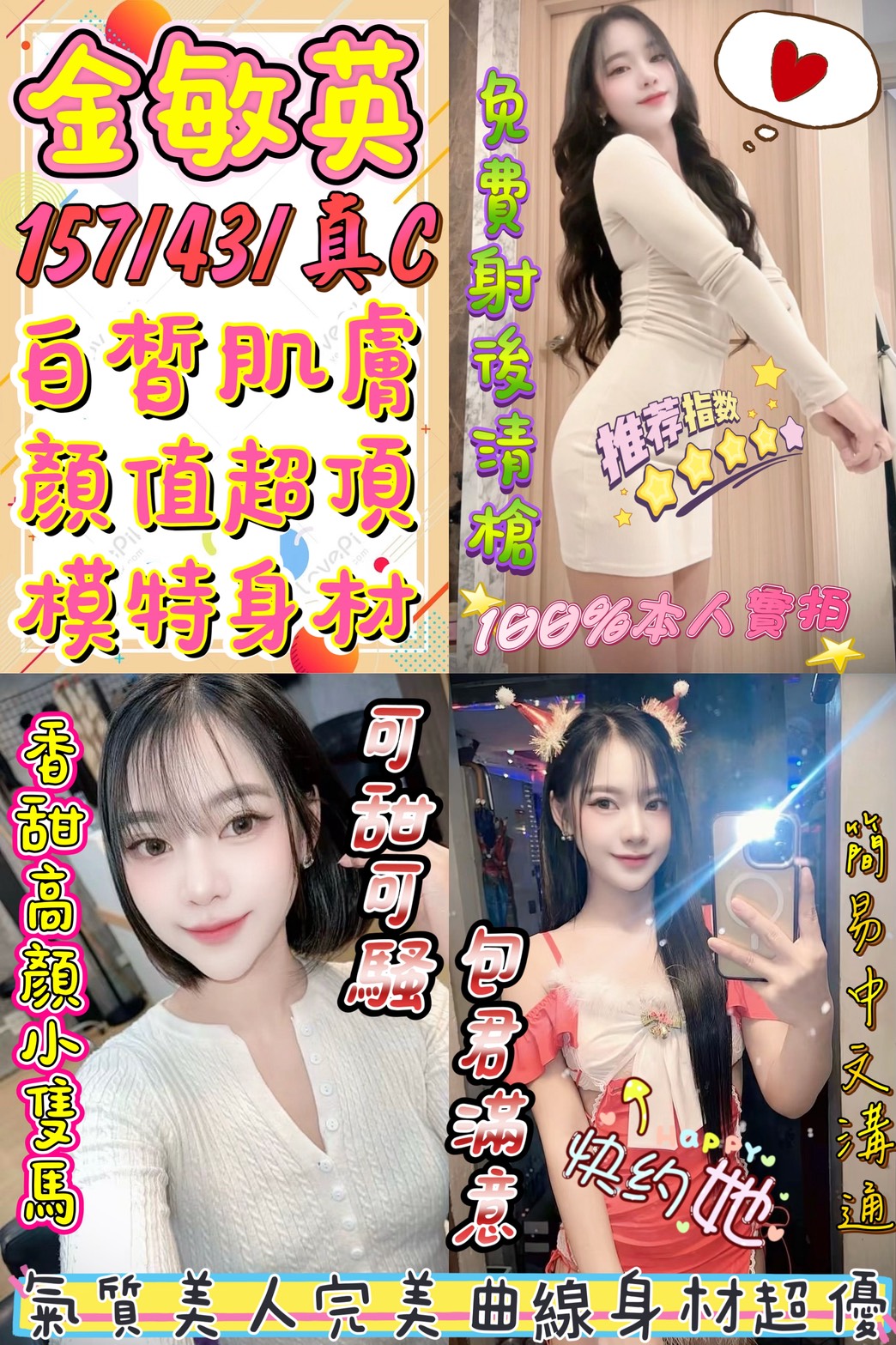 🌸 金敏英 157 / 43 / 真C 【超頂顏值 ‧ 氣質美人 ‧ 香甜高顏小隻馬】 🔥 狂野亮點:可甜可騷的模特級尤物 擁有 157cm/43kg 的完美曲線,金敏英不僅有著令人窒息的超頂顏值,全身肌膚更是如雪般白皙滑嫩。她是那種走在路上回頭率 100% 的氣質正妹,房門一關卻能切換成**「可甜可騷」**的撩人模式。 最貼心的是,她不僅能用簡易中文溝通,還提供**【免費射後清槍】**服務,保證讓哥哥從視覺到身心都得到最完美的終結。想要體驗 100% 本人實拍的真實震撼?預約敏英,包君滿意!