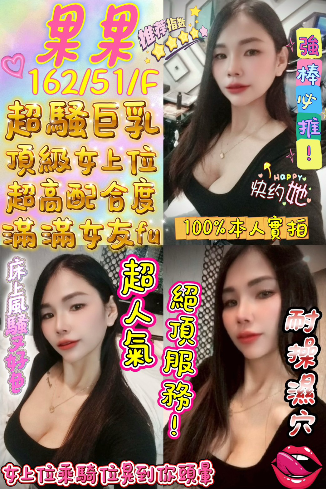 果果 162 / 51 / F 🔥 爆乳新寵【全能系爆乳 ‧ 無套吹大師 ‧ 深夜最強排毒】 「當 F 級豪乳遇上無套深喉嚨,這場肉慾盛宴您準備好入席了嗎?」 如果您已經厭倦了索然無味的例行公事,如果您渴望的是一場從頭到腳、徹徹底底的視覺與肉體雙重霸凌,那麼 【果果】 就是您此生必點的終極名單!162公分的高挑比例,隱藏著 51公斤的曼妙曲線,而那對 天然、軟嫩、單手完全無法掌握的 F 罩杯,就是她征服無數老司機的重裝武器。包裹著極度不科學的傲人雙峰。她不只是視覺上的肉彈,更是床榻上的「渴物」,一進房那種主動勾人的眼神,保證讓您瞬間繳械!