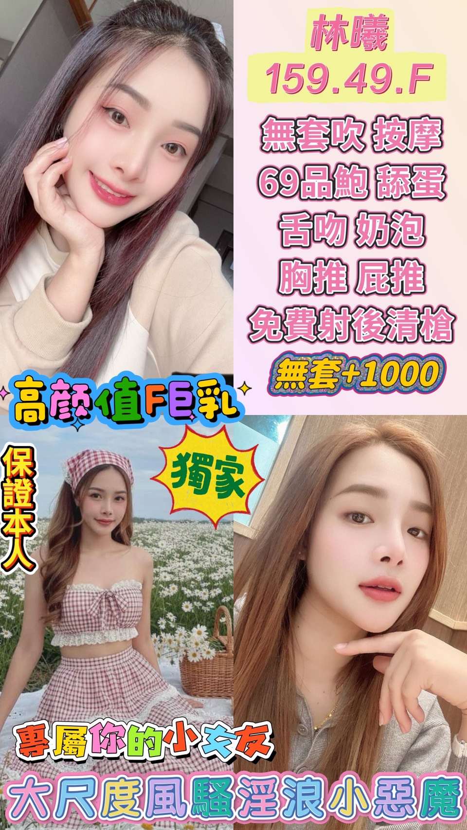 🌸 林曦 159 / 49 / F 【顏值天花板 ‧ F奶純欲戰神 ‧ 無套內射解禁】 🔥 狂野亮點:看一眼就戀愛的極品臉蛋 159cm 的精緻身高,配上那對讓所有男人都瘋狂的 F 罩杯核彈乳。更犯規的是她那張超高顏值的精緻小臉,清純中帶著勾人的欲感,光是看著她的眼睛,你就已經繳械一半! 林曦不僅長得正,玩得更開!她是桃園區少數支持 【無套內射】 的頂級女神。想感受溫熱精華噴發在「超正女神」體內的禁忌快感嗎?再加上自慰秀與免費射後清槍,這種視覺與感官的雙重巔峰,今天不搶位真的會後悔!