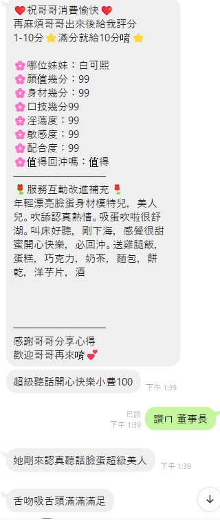 🌈服務項目: 無套吹/共浴殘廢澡/親密KISS(視個人衛生和妹妹現場感覺.自行開發)/六九/品鮑/舔蛋/按摩/奶泡/深喉嚨/冰火/艷舞/胸磨臉/ 🌈加值服務: 顏射+500 口爆+500 吞精(含口爆)+1000 攝影(不露臉)+1000 可3+1 可包夜5+3 可配合情趣用品(請自備)
