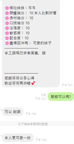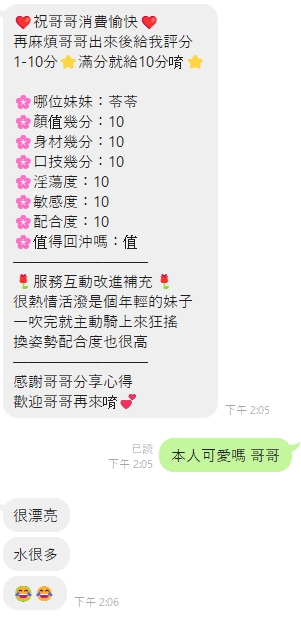 🌈服務項目: 無套吹/共浴殘廢澡/親密KISS(視個人衛生和妹妹現場感覺.自行開發)/六九/品鮑/舔蛋/按摩/奶泡/水中蕭/胸磨臉/冰火 🌈加值服務: 顏射+500 口爆+500 可3+1 可包夜5+3 可配合情趣用品(請自備)